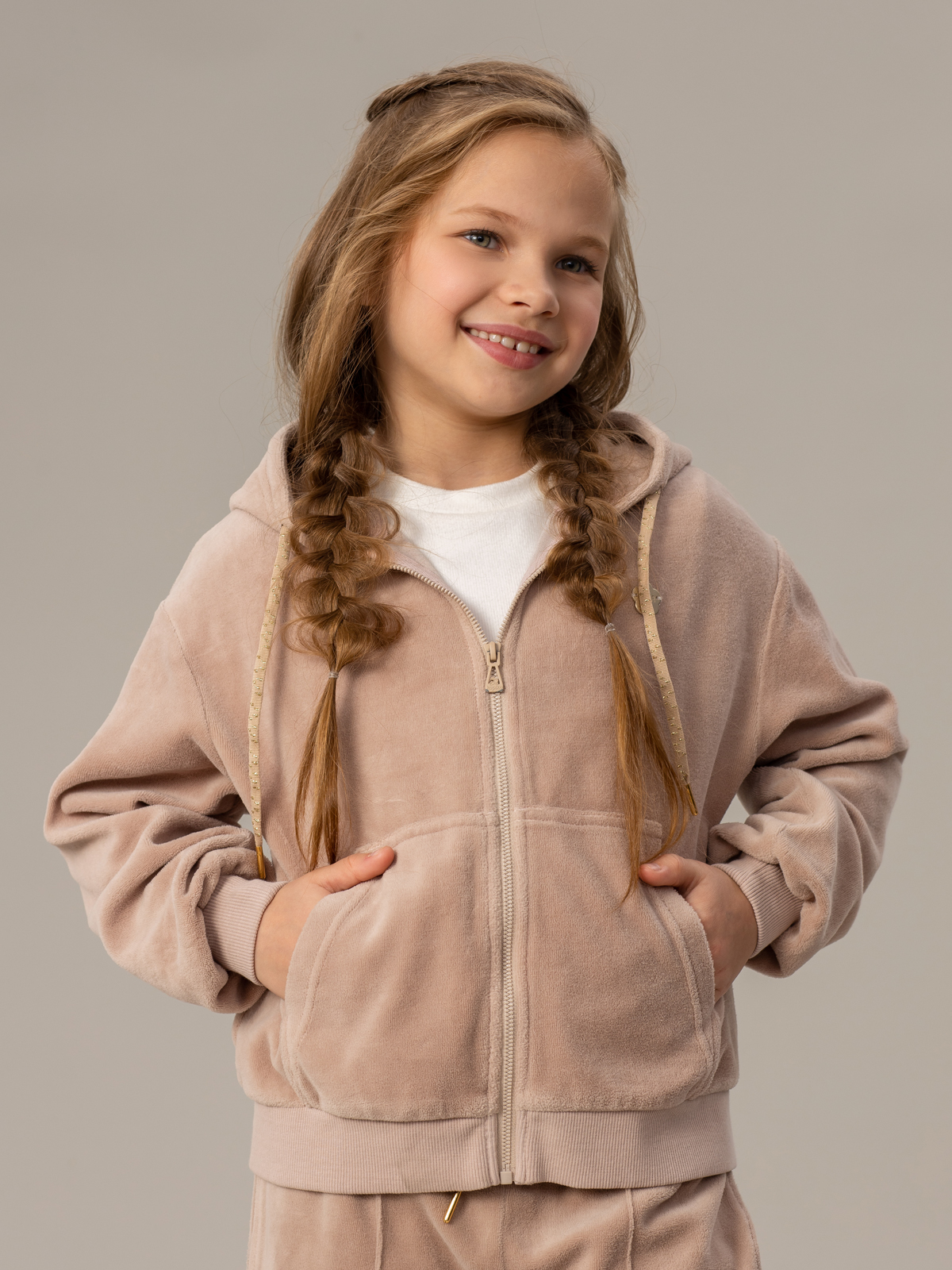 Мягкое худи из нежного велюра бежевого цвета — идеальный выбор для создания уютного образа. Модель дополнена практичной молнией, удобным карманом-кенгуру и эластичными рибами по низу рукавов и изделия, что обеспечивает комфортную посадку. Особенно стильно худи смотрится в комплекте с велюровыми брюками того же оттенка — такой дуэт создаст гармоничный и модный образ. Велюр приятен к телу, хорошо держит форму и прост в уходе. Сочетание комфорта и элегантности делает её незаменимой вещью в гардеробе современной девочки.