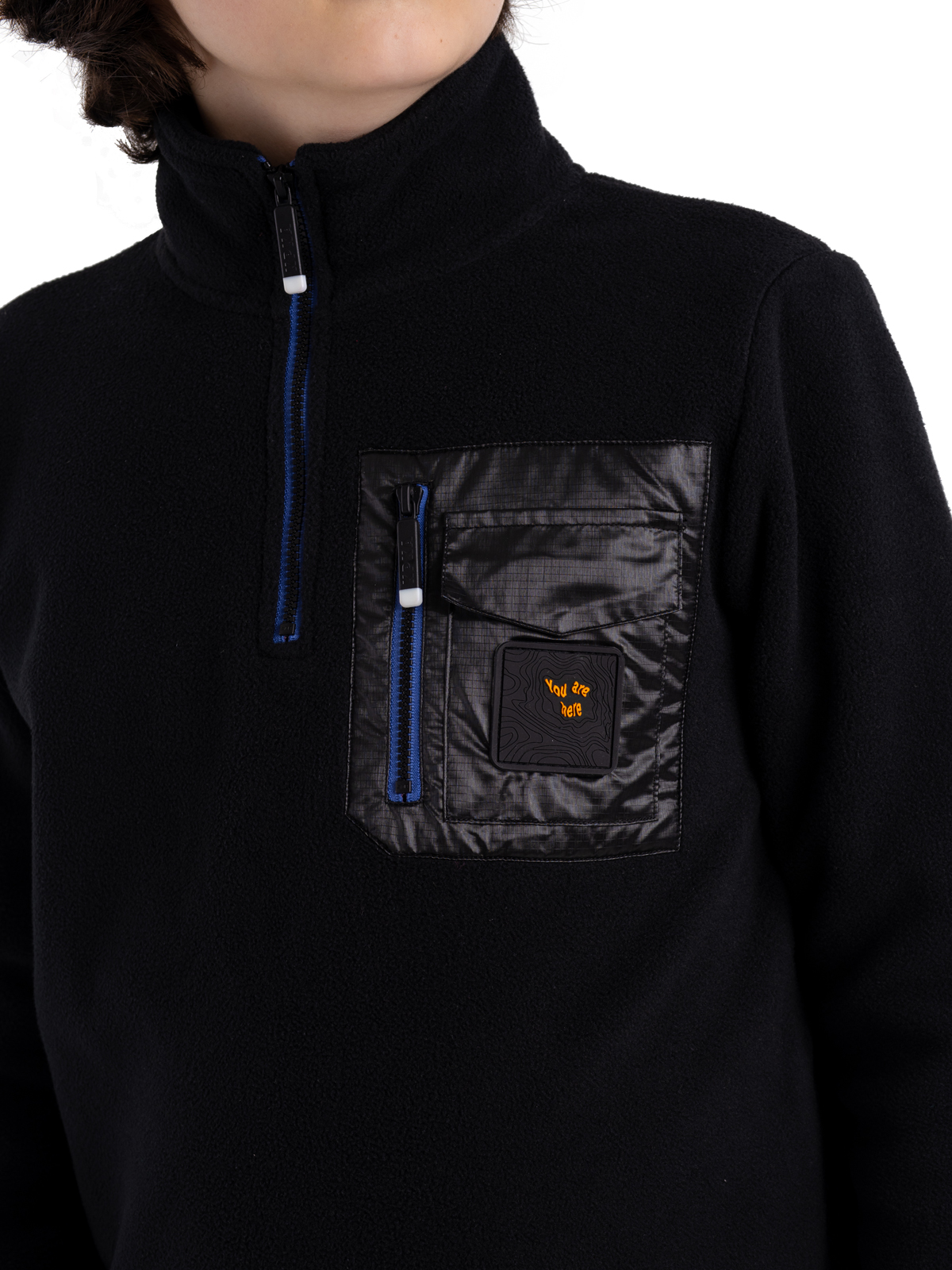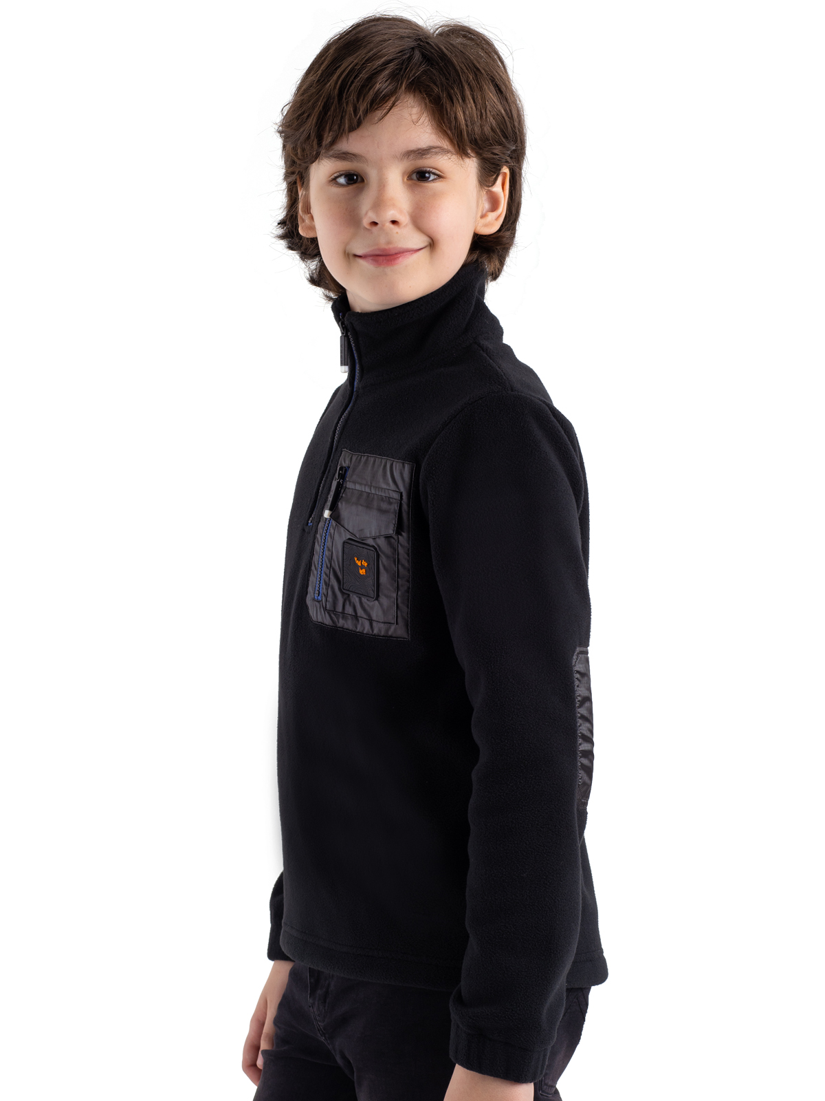 Флисовая толстовка свободного кроя на короткой молнии для мальчика-подростка выполнена из мягкого микрофлиса черного цвета, акцентирована функциональными карманами из ткани рипстоп на груди, стильным патчем и контрастными молниями. Высокий воротник-стойка защищает от ветра. Удобная трендовая толстовка окутывает теплом и уютом, идеальна для холодных дней.