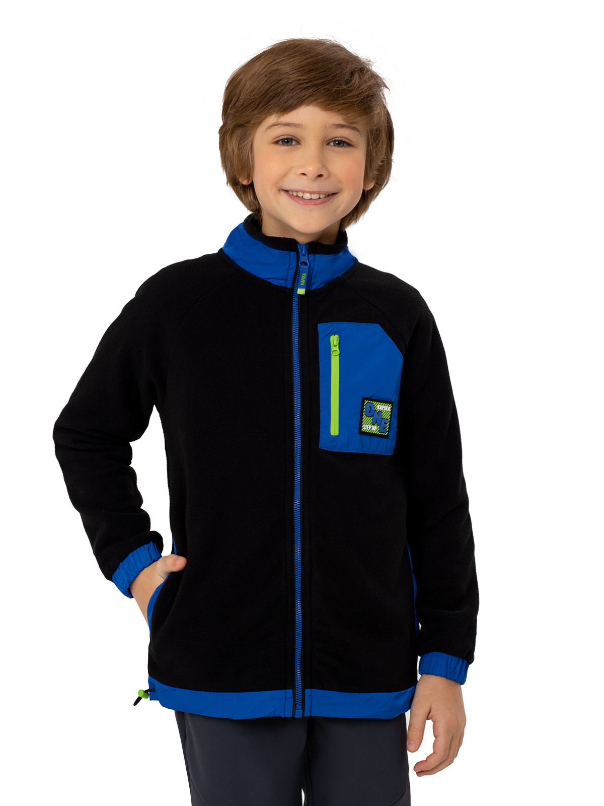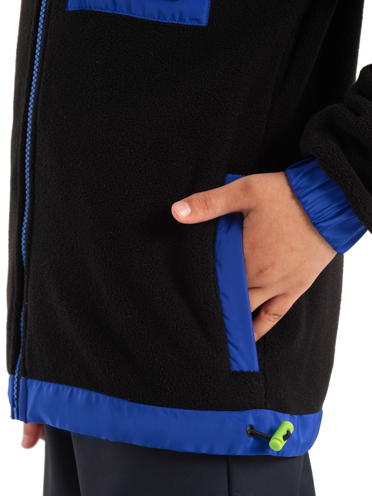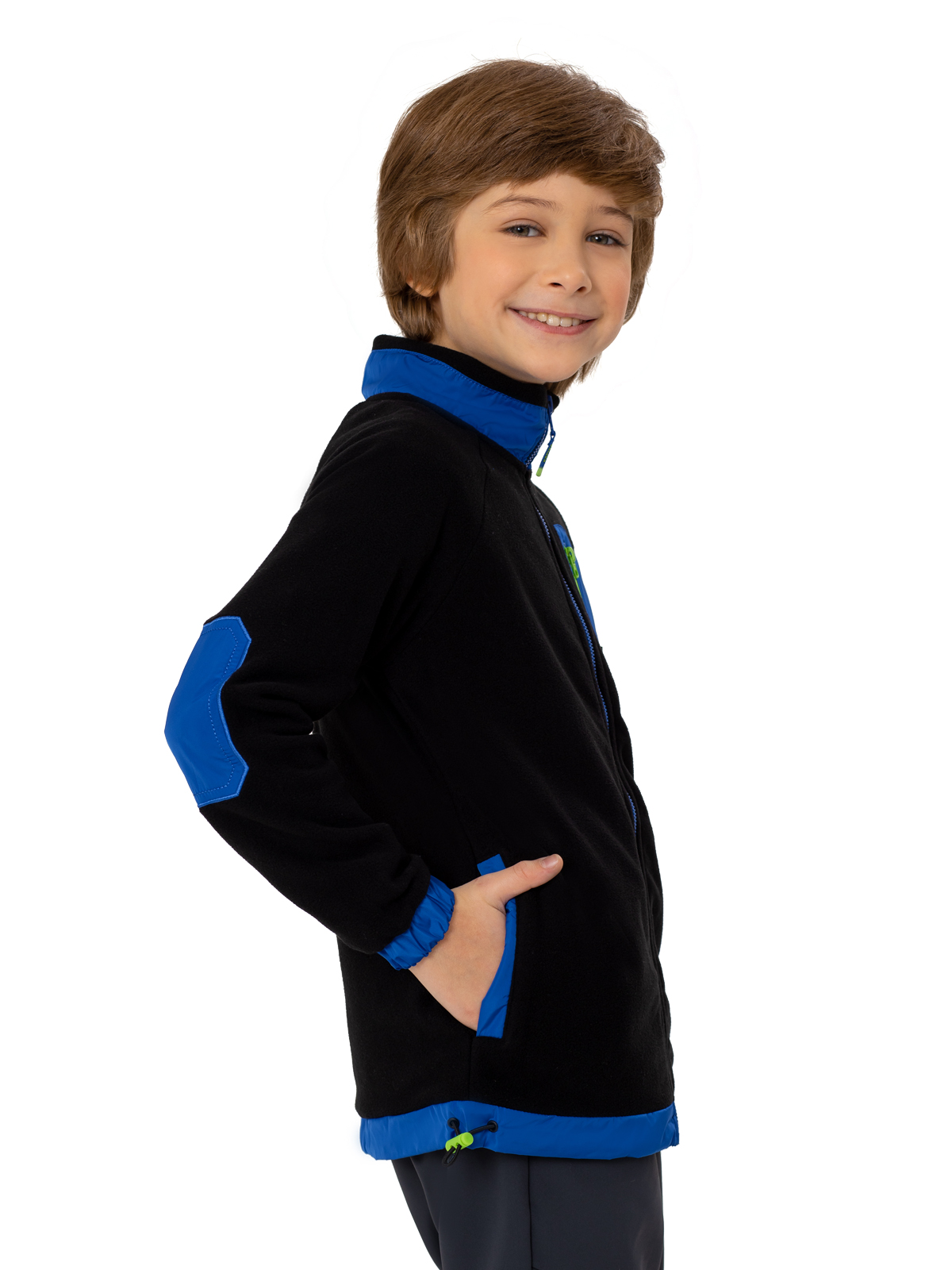 Теплая флисовая толстовка в черном цвете с яркими акцентами станет стильным элементом гардероба мальчика-подростка. Материал обеспечивает комфорт и отличную теплоизоляцию. Дизайн модели выделяется контрастными синими элементами: по стойке воротника, низу изделия и накладкам на локтях. Особую изюминку придает накладной карман на груди с салатовой молнией и брендированным патчем. Застежка на молнию обеспечивает удобство использования, а кулиска по низу изделия позволяет регулировать посадку. Эластичные манжеты по низу и манжетам гарантируют комфортную носку и защиту от ветра. Эта практичная толстовка идеально подойдет как для повседневной носки, так и для активного отдыха, сочетая в себе функциональность и модный дизайн.