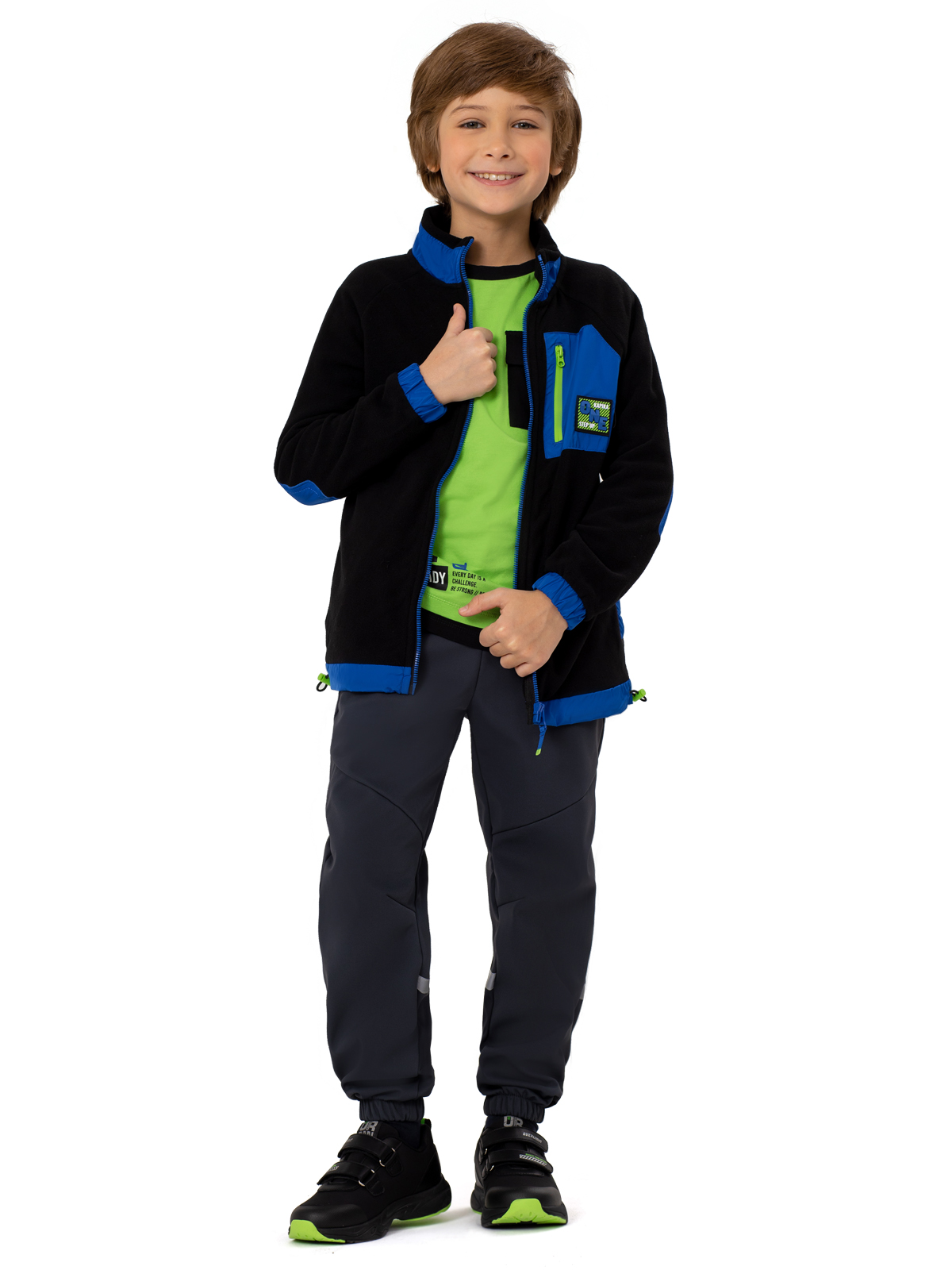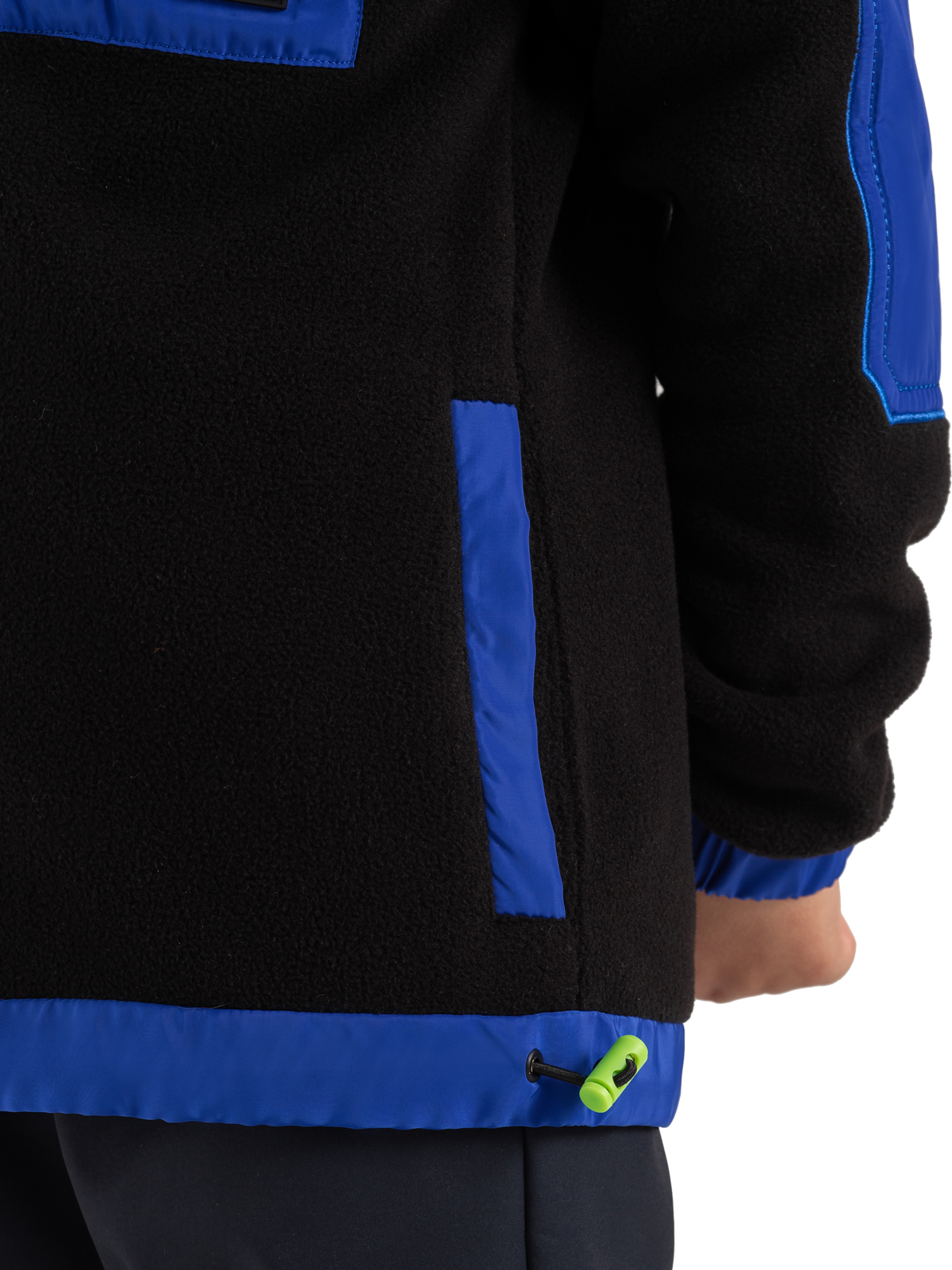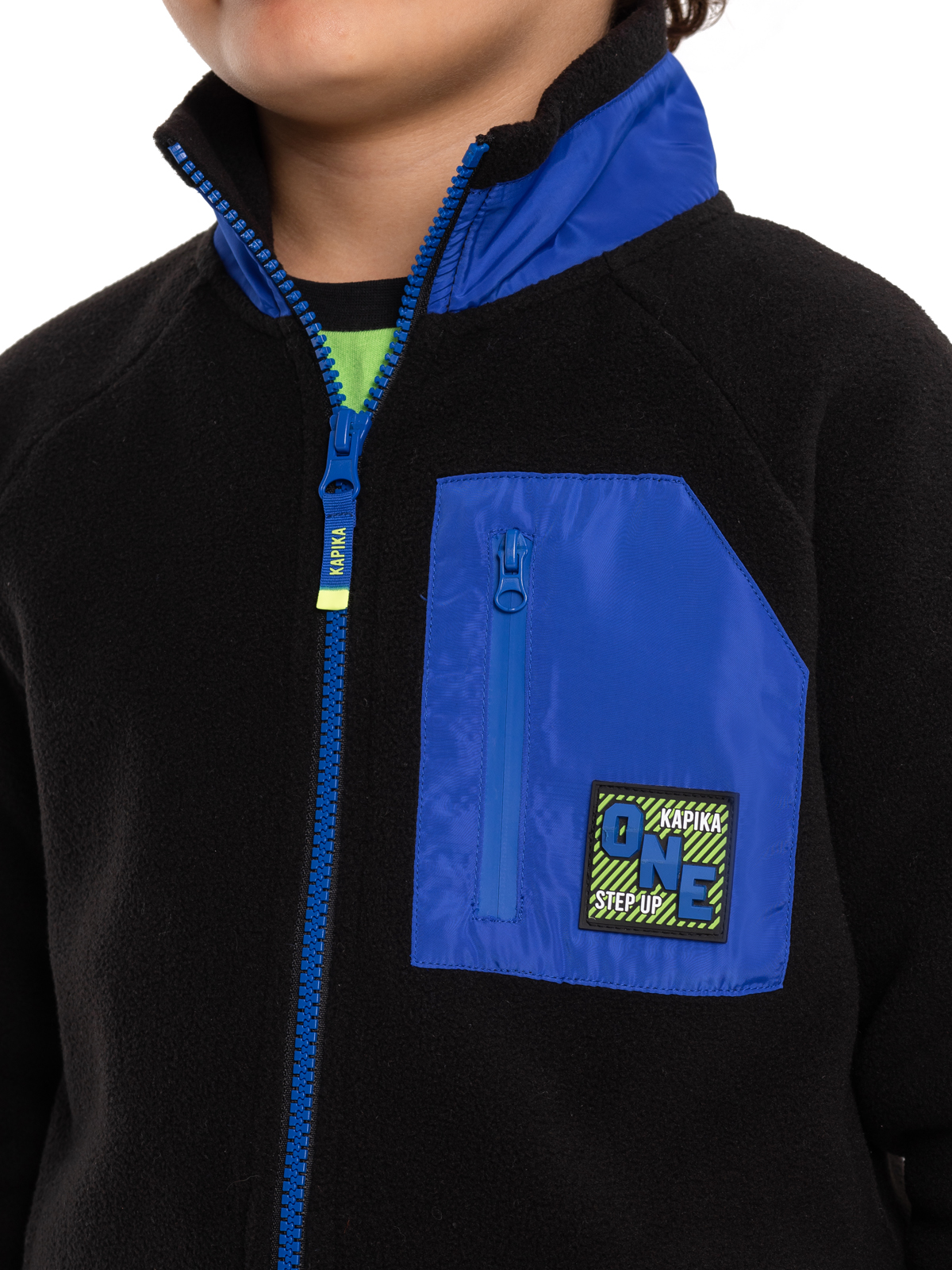 Теплая флисовая толстовка в черном цвете с яркими акцентами станет стильным элементом гардероба мальчика-подростка. Материал обеспечивает комфорт и отличную теплоизоляцию. Дизайн модели выделяется контрастными синими элементами: по стойке воротника, низу изделия и накладкам на локтях. Особую изюминку придает накладной карман на груди с салатовой молнией и брендированным патчем. Застежка на молнию обеспечивает удобство использования, а кулиска по низу изделия позволяет регулировать посадку. Эластичные манжеты по низу и манжетам гарантируют комфортную носку и защиту от ветра. Эта практичная толстовка идеально подойдет как для повседневной носки, так и для активного отдыха, сочетая в себе функциональность и модный дизайн.