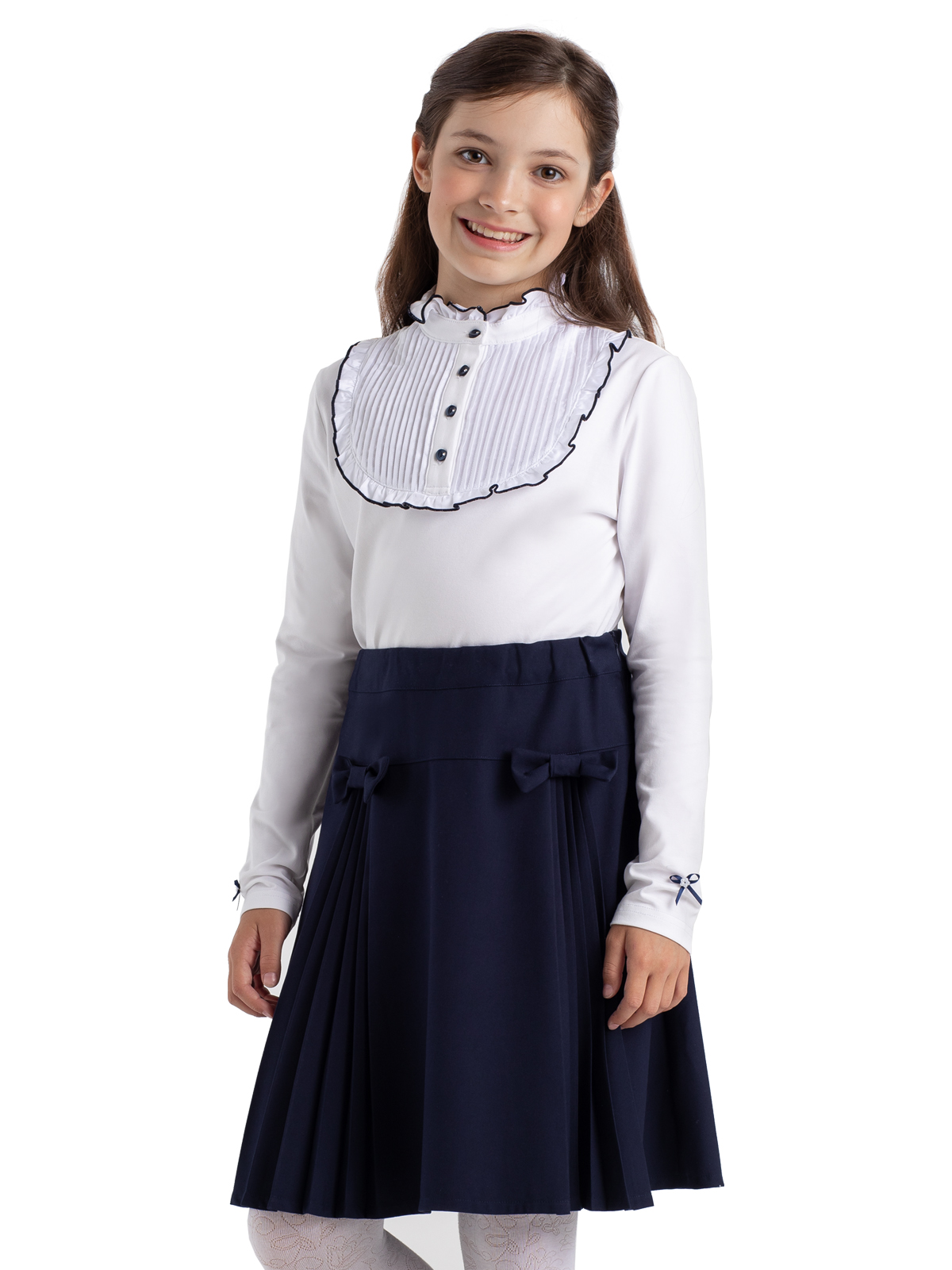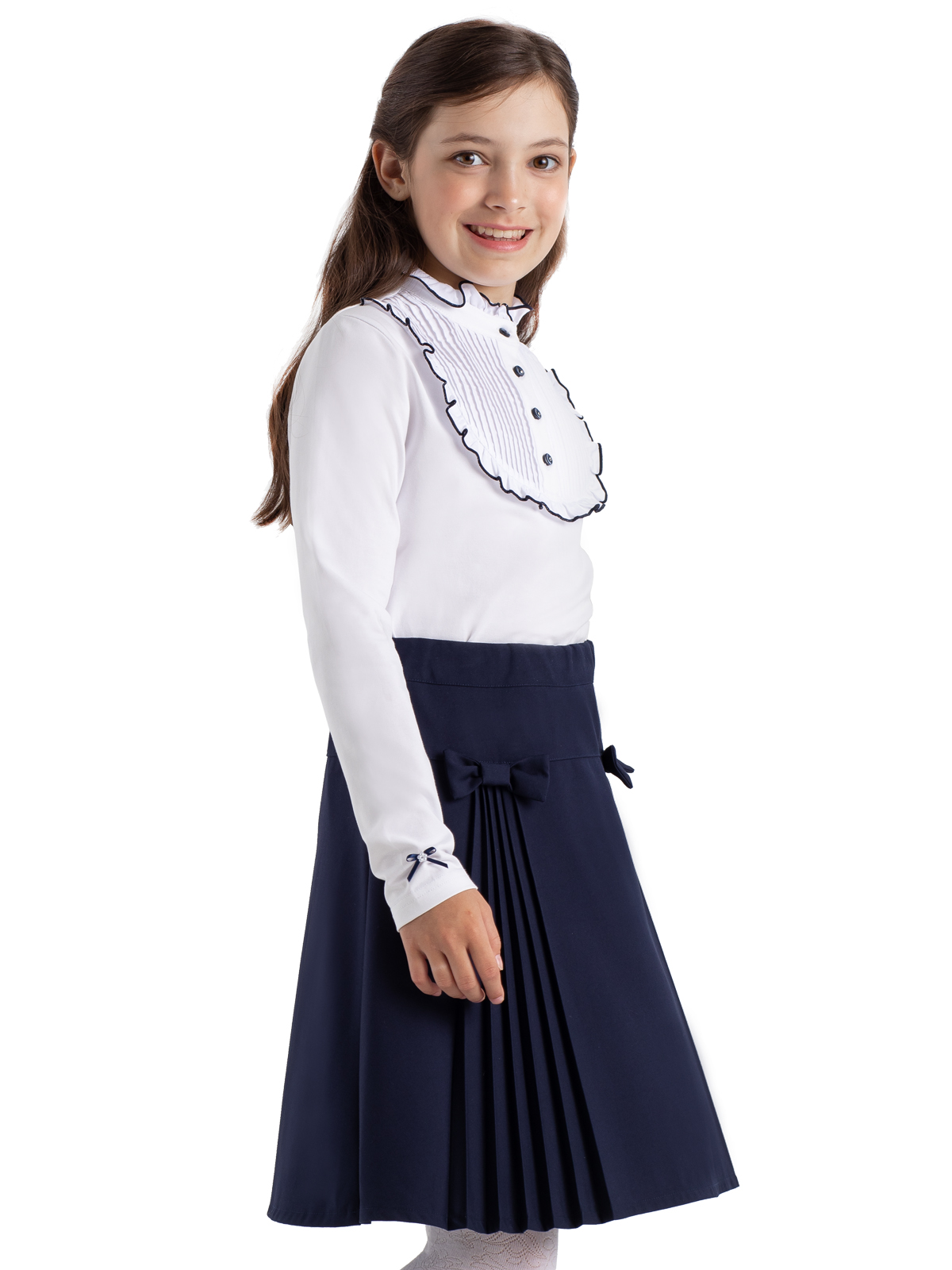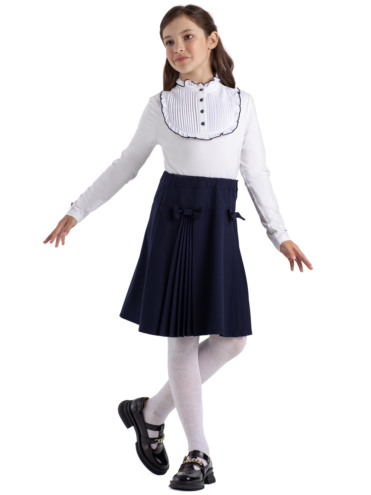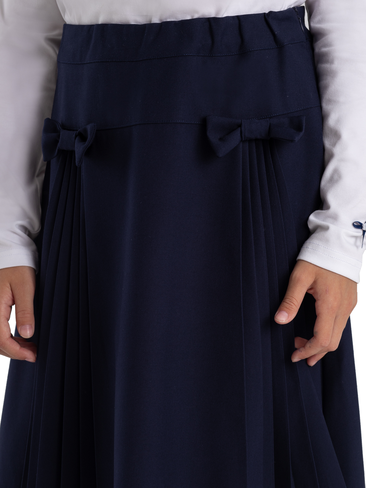 Школьная юбка темно-синего цвета выполнена из высококачественной поливискозы. Юбка для школы декорирована плиссированными вставками по переду и бантиками из основной ткани. Школьная юбка имеет утяжку по талии за счет, вставленной внутрь резинки с перфорационными отверстиями. Поливискоза приятна к телу, ткань не скатывается, мало мнется, легка в уходе, сохраняет форму и цвет после многих стирок.