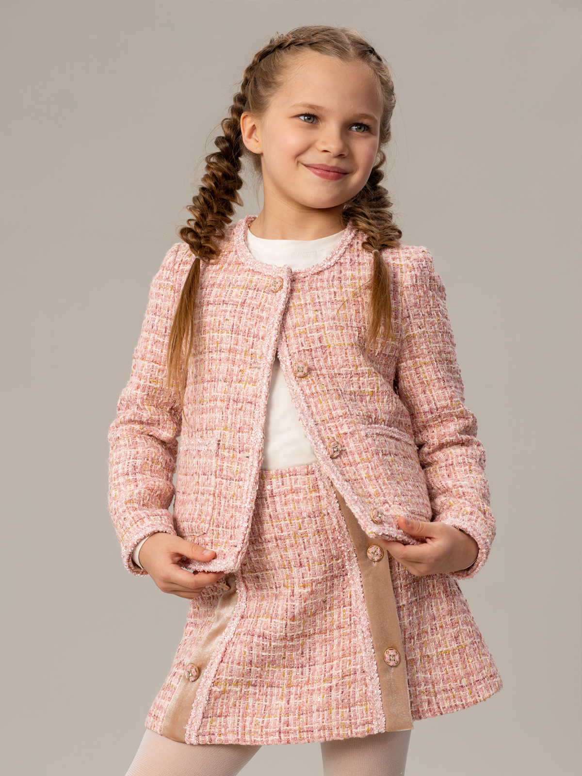 Изящный жакет из твида в нежно-розовом оттенке — это воплощение утонченного стиля и элегантности. Модель отличается классическим прямым кроем и стильным дизайном, который делает её универсальным элементом гардероба.Особую изысканность жакету придают накладные карманы, декоративная тесьма и пуговицы, добавляющая изделию роскошный вид. Этот жакет прекрасно сочетается как с юбкой, так и с платьем из той же ткани. Создавая гармоничный ансамбль, он становится идеальным выбором как для праздничных мероприятий, так и для повседневной носки. Благодаря качественным материалам с содержанием шерсти, жакет сохраняет форму и остается приятным к телу, не мнется и прост в уходе, что делает его практичным и долговечным.